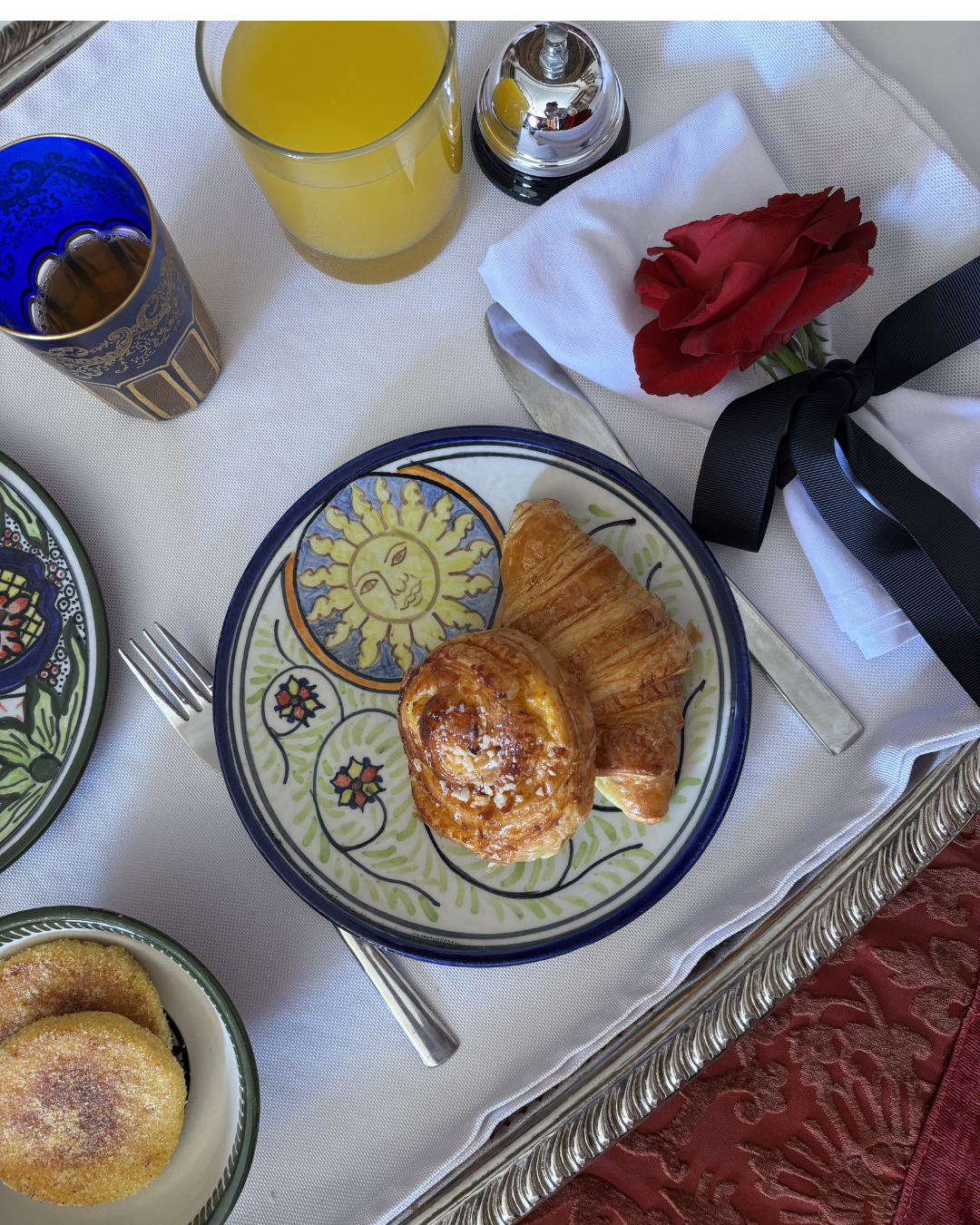 This salad and dessert plate is inspired by the golden glow of Dar El Bacha’s courtyard. A playful sun design and vibrant floral patterns that bring an extra touch of radiance to your table—just the thing for serving sweet treats that shine as brightly as the sun.